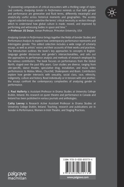 Analysing Gender in Performance brings together the fields of Gender Studies and Performance Analysis to explore how contemporary performance represents and interrogates gender. This edited collection includes a wide range of scholarly essays, as well as artists' voices and their accounts of their works and practices. The Introduction outlines the book's key approaches to concepts in English language gender discourses and gender's intersectionalities, and sets out the approaches to performance analysis and methods of research employed by the various contributors. The book focuses on performances from the Global North, staged over the past fifty years. Case studies are diverse, ranging from site-specific, dance theatre, speculative drag, installation, and music video performances to Mabou Mines, Churchill, Shakespeare and Ibsen. Contributors explore how gender intersects with sexuality, social class, race, ethnicity, indigeneity, culture and history. Read individually or in tension with one another, the essays confront the contemporary complexities of analysing gender in performance.