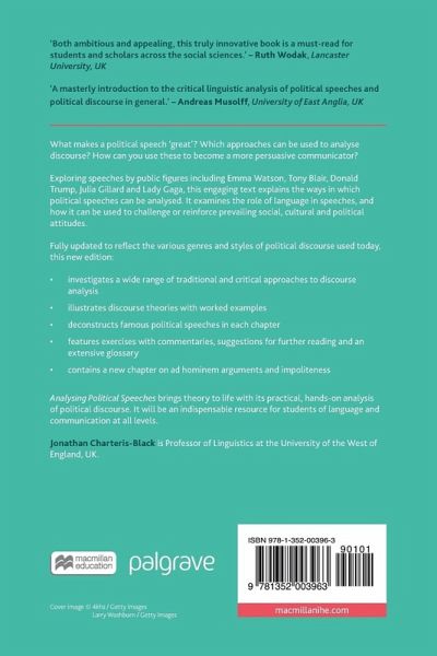 Exploring speeches by public figures such as Emma Watson, Tony Blair, Donald Trump, Julia Gillard and Lady Gaga, this engaging textbook explains the ways in which political speeches can be analysed. It examines the role of language in speeches and how it can be used to challenge or reinforce prevailing social, cultural and political attitudes. Each chapter introduces a particular discourse approach and then applies this in a model analysis of a passage of text. The chosen texts concern issues of social, cultural and political importance that address topics of significant importance to the audience to which they were delivered. Students are encouraged to engage with the text and consider how approaches to text analysis, such as cohesion, context analysis and metaphor analysis, may be adapted to provide a more critical perspective.