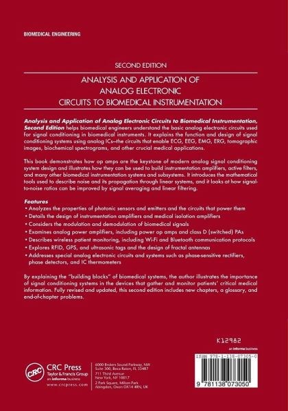 Analysis and Application of Analog Electronic Circuits to Biomedical Instrumentation, Second Edition helps biomedical engineers understand the basic analog electronic circuits used for signal conditioning in biomedical instruments. It explains the function and design of signal conditioning systems using analog ICs-the circuits that enable ECG, EEG, EMG, ERG, tomographic images, biochemical spectrograms, and other crucial medical applications.