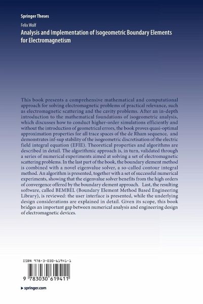 This book presents a comprehensive mathematical and computational approach for solving electromagnetic problems of practical relevance, such as electromagnetic scattering and the cavity problems. After an in-depth introduction to the mathematical foundations of isogeometric analysis, which discusses how to conduct higher-order simulations efficiently and without the introduction of geometrical errors, the book proves quasi-optimal approximation properties for all trace spaces of the de Rham sequence, and demonstrates inf-sup stability of the isogeometric discretisation of the electric field integral equation (EFIE). Theoretical properties and algorithms are described in detail. The algorithmic approach is, in turn, validated through a series of numerical experiments aimed at solving a set of electromagnetic scattering problems. In the last part of the book, the boundary element method is combined with a novel eigenvalue solver, a so-called contour integral method. An algorithmis presented, together with a set of successful numerical experiments, showing that the eigenvalue solver benefits from the high orders of convergence offered by the boundary element approach. Last, the resulting software, called BEMBEL (Boundary Element Method Based Engineering Library), is reviewed: the user interface is presented, while the underlying design considerations are explained in detail. Given its scope, this book bridges an important gap between numerical analysis and engineering design of electromagnetic devices.