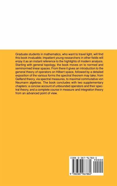 Graduate students in mathematics, who want to travel light, will find this book invaluable; impatient young researchers in other fields will enjoy it as an instant reference to the highlights of modern analysis. Starting with general topology, it moves on to normed and seminormed linear spaces. From there it gives an introduction to the general theory of operators on Hilbert space, followed by a detailed exposition of the various forms the spectral theorem may take; from Gelfand theory, via spectral measures, to maximal commutative von Neumann algebras. The book concludes with two supplementary chapters: a concise account of unbounded operators and their spectral theory, and a complete course in measure and integration theory from an advanced point of view.