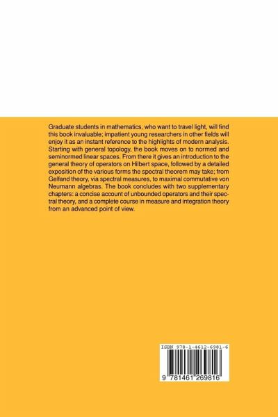 Graduate students in mathematics, who want to travel light, will find this book invaluable; impatient young researchers in other fields will enjoy it as an instant reference to the highlights of modern analysis. Starting with general topology, it moves on to normed and seminormed linear spaces. From there it gives an introduction to the general theory of operators on Hilbert space, followed by a detailed exposition of the various forms the spectral theorem may take; from Gelfand theory, via spectral measures, to maximal commutative von Neumann algebras. The book concludes with two supplementary chapters: a concise account of unbounded operators and their spectral theory, and a complete course in measure and integration theory from an advanced point of view.