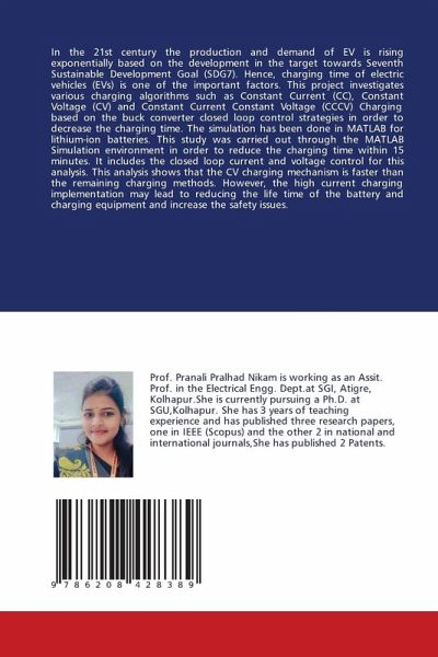 In the 21st century the production and demand of EV is rising exponentially based on the development in the target towards Seventh Sustainable Development Goal (SDG7). Hence, charging time of electric vehicles (EVs) is one of the important factors. This project investigates various charging algorithms such as Constant Current (CC), Constant Voltage (CV) and Constant Current Constant Voltage (CCCV) Charging based on the buck converter closed loop control strategies in order to decrease the charging time. The simulation has been done in MATLAB for lithium-ion batteries. This study was carried out through the MATLAB Simulation environment in order to reduce the charging time within 15 minutes. It includes the closed loop current and voltage control for this analysis. This analysis shows that the CV charging mechanism is faster than the remaining charging methods. However, the high current charging implementation may lead to reducing the life time of the battery and charging equipment and increase the safety issues.