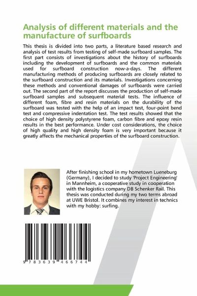 This thesis is divided into two parts, a literature based research and analysis of test results from testing of self-made surfboard samples. The first part consists of investigations about the history of surfboards including the development of surfboards and the common materials used for surfboard construction now-a-days. The different manufacturing methods of producing surfboards are closely related to the surfboard construction and its materials. Investigations concerning these methods and conventional damages of surfboards were carried out. The second part of the report discusses the production of self-made surfboard samples and subsequent material tests. The influence of different foam, fibre and resin materials on the durability of the surfboard was tested with the help of an impact test, four-point bend test and compressive indentation test. The test results showed that the choice of high density polystyrene foam, carbon fibre and epoxy resin results in the best performance. Under cost considerations, the choice of high quality and high density foam is very important because it greatly affects the mechanical properties of the surfboard construction.
