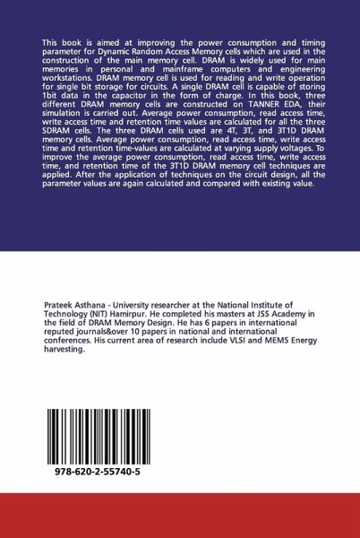 This book is aimed at improving the power consumption and timing parameter for Dynamic Random Access Memory cells which are used in the construction of the main memory cell. DRAM is widely used for main memories in personal and mainframe computers and engineering workstations. DRAM memory cell is used for reading and write operation for single bit storage for circuits. A single DRAM cell is capable of storing 1bit data in the capacitor in the form of charge. In this book, three different DRAM memory cells are constructed on TANNER EDA, their simulation is carried out. Average power consumption, read access time, write access time and retention time values are calculated for all the three SDRAM cells. The three DRAM cells used are 4T, 3T, and 3T1D DRAM memory cells. Average power consumption, read access time, write access time and retention time-values are calculated at varying supply voltages. To improve the average power consumption, read access time, write access time, and retention time of the 3T1D DRAM memory cell techniques are applied. After the application of techniques on the circuit design, all the parameter values are again calculated and compared with existing value.