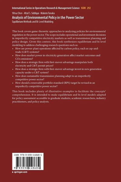 This book covers game-theoretic approaches to analyzing policies for environmental regulation in the power sector. The scope includes operational and investment decisions in imperfectly competitive electricity markets as well as transmission planning and policy design. Given this context, this book synthesizes equilibrium and bi-level modeling to address challenging research questions such as: - How are power-plant operations affected by carbon policy, such as cap-and-trade (C&T) systems? - How does market power in electricity generation affect market outcomes and CO2 emissions? - How does a strategic firm with first-mover advantage manipulate both electricity and C&T permit prices? - How does a strategic firm with first-mover advantage invest in new generation capacity under a C&T system? - How does sustainable transmission planning adapt to an imperfectly competitive power sector? - How should arenewable portfolio standard (RPS) target be revised in an imperfectly competitive power sector?