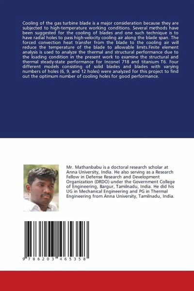 Cooling of the gas turbine blade is a major consideration because they are subjected to high-temperature working conditions. Several methods have been suggested for the cooling of blades and one such technique is to have radial holes to pass high-velocity cooling air along the blade span. The forced convection heat transfer from the blade to the cooling air will reduce the temperature of the blade to allowable limits.Finite element analysis is used to analyze the thermal and structural performance due to the loading condition in the present work to examine the structural and thermal steady-state performance for Inconel 718 and titanium T6. Four different models consisting of solid blades and blades with varying numbers of holes (6, 9, and 12 holes) were analyzed for this project to find out the optimum number of cooling holes for good performance.