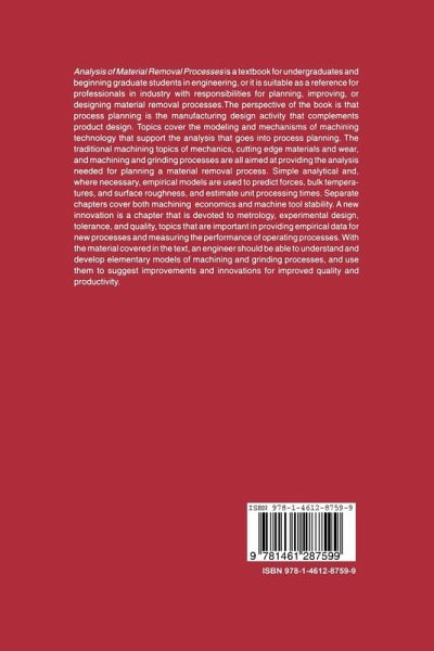 Metal removal processes - cutting and grinding in this book - are an integral part of a large number of manufacturing systems, either as the primary manufacturing process, or as an important part of preparing the tooling for other manufacturing processes. In recent years, industry and educational institutions have concentrated on the metal removal system, perhaps at the expense of the process. This book concentrates on metal removal processes, particularly on the modeling aspects that can either give a direct answer or suggest the general requirements as to how to control, improve or change a metal removal process. This modeling knowledge is more important with automated computer controlled systems than it has ever been before, because quantitative knowledge is needed to design and operate these systems. This senior undergraduate/graduate textbook is aimed at providing the quantitative knowledge, often times at an elementary level, for handling the technological aspects of setting up and operating a metal removal process and interpreting the experience of planning, operating and improving a metal removal process based on rule of thumb approaches.