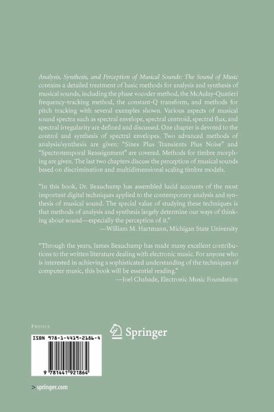 The problems of analyzing and synthesizing musical timbres have been prevalent for over half a century, and a book length exploration of this large and complex subject has been long overdue. Analysis, Synthesis, and Perception of Musical Sounds: Sound of Music consists of eight chapters that span the range from tutorial introduction to advanced research and application to speculative assessment of its various techniques. All of the contributors use a generalized additive sine wave model for describing musical timbre which gives a conceptual unity but is of sufficient utility to be adapted to many different tasks. The authors represent an international community of researchers and teachers in the field of analysis/synthesis/perception, and this book reflects the important trends and interests current in the subject. Due to its breadth, students will find the book a thorough introduction to current thinking and implementation of additive sine wave timbral models. Researchers new to the field will find a canvas of applications with citations to the relevant literature, which will also benefit the teacher searching for an effective syllabus. Due to its scope, Analysis, Synthesis, and Perception of Musical Sounds will become the standard reference in the field and will be seen as the catalyst for exciting research in the years ahead.