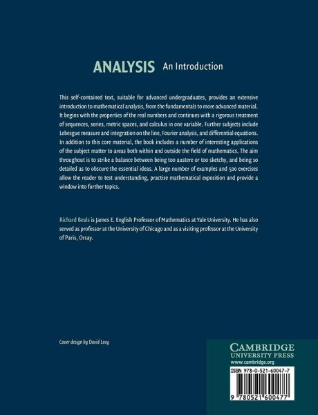 This self-contained text, suitable for advanced undergraduates, provides an extensive introduction to mathematical analysis, from the fundamentals to more advanced material. It begins with the properties of the real numbers and continues with a rigorous treatment of sequences, series, metric spaces, and calculus in one variable. Further subjects include Lebesgue measure and integration on the line, Fourier analysis, and differential equations. In addition to this core material, the book includes a number of interesting applications of the subject matter to areas both within and outside the field of mathematics. The aim throughout is to strike a balance between being too austere or too sketchy, and being so detailed as to obscure the essential ideas. A large number of examples and 500 exercises allow the reader to test understanding, practise mathematical exposition and provide a window into further topics.