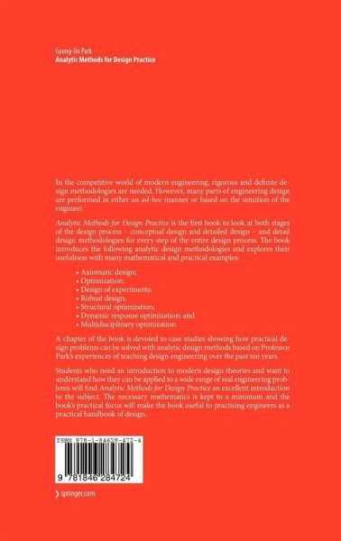 In the competitive world of modern engineering, rigorous and definite design methodologies are needed. However, many parts of engineering design are performed in either an ad-hoc manner or based on the intuition of the engineer. This is the first book to look at both stages of the design process - conceptual design and detailed design - and detail design methodologies for every step of the design process. The following analytic design methodologies are introduced and their usefulness is explored with many mathematical and practical examples: Axiomatic design; Optimization; Design of experiments; Robust design; Structural optimization; Dynamic response optimization; and Multidisciplinary optimization. Case studies show how practical design problems can be solved with analytic design methods. Students will find this book an excellent introduction to the subject. The book's practical focus will interest practising engineers as a practical handbook of design.