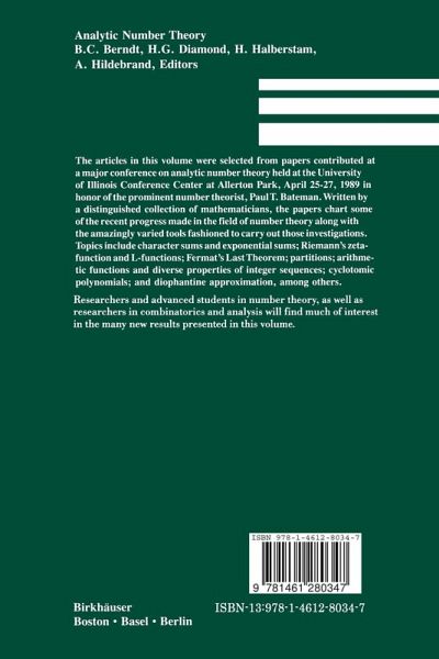 q-Trinomial Coefficients and Rogers-Ramanujan Identities.- Evaluations of Selberg Character Sums.- Oscillations of Quadratic L-Functions.- Elementary Proof of a Theorem of Bateman.- The Prime k-Tuplets Conjecture on Average.- On Arithmetic Functions Involving Consecutive Divisors.- Small Zeros of Quadratic Forms Modulo p, II.- Zeros of Derivatives of the Riemann Zeta-Function near the Critical Line.- On some Exponential Sums.- On the Integers n for which ?(n) = k.- A Boundary Problem for a Pair of Differential-Delay Equations related to Sieve Theory, I.- Some Remarks about Multiplicative Functions of Modulus 1.- On the Normal Behavior of the Iterates of some Arithmetic Functions.- On the Number ofPartitions of n without a Given Subsum, II.- On Gaps between SquarefreeNumbers.- Some Arithmetical Semigroups.- Norms in Arithmetic Progressions.- Lower Bounds for Least Quadratic Non-Residues.- Some Conjectures in Analytic Number Theory and their Connection with Fermat's Last Theorem.- Modular Integrals and their Mellin Transforms.- A Congruence for Generalized Frobenius Partitions with 3 Colors Modulo Powers of 3.- The Coefficients of Cyclotomic Polynomials.- The Rudin-Shapiro Sequence, Ising Chain, and Paperfolding.- On Binomial Equations over Function Fields and a Conjecture of Siegel.- Best Possible Results on the Density of Sumsets.- Some Powers of the Euler Product.- A Divergent Argument Concerning Hadamard Roots of Rational Functions.- Diagonalizing Eisenstein Series. I.- Some Binary Partition Functions.- On the Minimal Level of Modular Forms.- Inequalities for Heights of Algebraic Subspaces and the Thue-Siegel Principle.- The Abstract Prime Number Theorem for Algebraic Function Fields.
