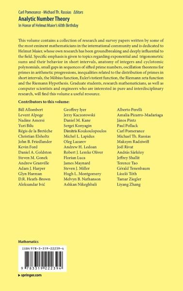 This volume contains a collection of research and survey papers written by some of the most eminent mathematicians in the international community and is dedicated to Helmut Maier, whose own research has been groundbreaking and deeply influential to the field. Specific emphasis is given to topics regarding exponential and trigonometric sums and their behavior in short intervals, anatomy of integers and cyclotomic polynomials, small gaps in sequences of sifted prime numbers, oscillation theorems for primes in arithmetic progressions, inequalities related to the distribution of primes in short intervals, the Möbius function, Euler's totient function, the Riemann zeta function and the Riemann Hypothesis. Graduate students, research mathematicians, as well as computer scientists and engineers who are interested in pure and interdisciplinary research, will find this volume a useful resource.