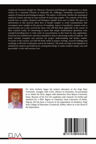 Analytical Chemistry Insight for Physical, Chemical and Biological Applications is a book written by a seasoned Chemist to demystify the challenges commonly encountered in analysis of chemical and biological samples. The author, in the book, clarifies the meaning of analytical science and step by step methods of analyzing samples. The contents of the book include how to analyze chemical and biological samples from start to finish. The pieces of information in this material show how to handle samples to avoid contamination that accompany most samples in the process of sampling. Aspects of qualitative analysis such as spectroscopic test is also covered for those who will find them applicable in the course of their research works. It's interesting to know that simple mathematical operations were included including how to write units of concentrations in this book for easy application. Statistical test methods have also been included to help in discussing results of analysis. The book includes examples and exercises for proper understanding and further studies. Everyone in the sciences can find the book useful in project writings, research findings and teachings at all levels of education and in the industry. The book can help in development of methods for analysis and build up on existing knowledge. It makes analysis simple, easy and practicable. A trier will convince you.