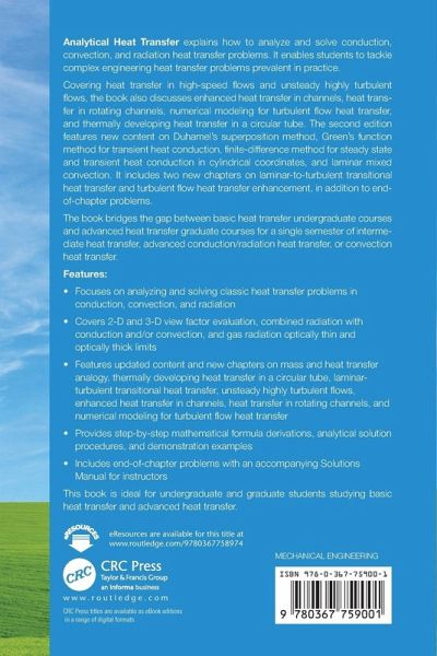 This book explains how to analyze and solve conduction, convection, and radiation heat transfer problems. It fills the gap between basic heat transfer undergraduate courses and advanced heat transfer graduate courses for one semester of intermediate heat transfer; advanced conduction/convection heat transfer; or radiation heat transfer.