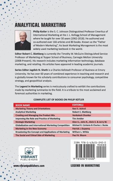 Legend in Marketing: Analytical Marketing by Philip Kotler Discover the future of marketing with Philip Kotler's groundbreaking book, "Legend in Marketing: Analytical Marketing." As a pioneering force in the field of marketing, Kotler provides a comprehensive exploration of analytical marketing strategies that are reshaping the industry. This indispensable guide equips you with the knowledge and tools to leverage data effectively, make strategic decisions, and drive impactful marketing outcomes. In this book, Kotler delves into advanced analytical techniques, offering practical advice and actionable insights that are vital for today's marketing professionals. Whether you're a seasoned expert or new to the field, this book will enhance your ability to analyze market trends, understand consumer behavior, and optimize your marketing campaigns. Elevate your marketing game and stay ahead of the curve with Kotler's expert guidance. This title is a must-read for anyone looking to master the art and science of marketing in the digital age. Explore, learn, and transform your marketing approach with this essential resource.