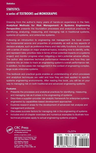 A Text on the Foundation Processes, Analytical Principles, and Implementation Practices of Engineering Risk Management Drawing from the author's many years of hands-on experience in the field, Analytical Methods for Risk Management: A Systems Engineering Perspectivepresents the foundation processes and analytical practices for identifying, analyzing, measuring, and managing risk in traditional systems, systems-of-systems, and enterprise systems. Balances Risk and Decision Theory with Case Studies and Exercises After an introduction to engineering risk management, the book covers the fundamental axioms and properties of probability as well as key aspects of decision analysis, such as preference theory and risk/utility functions. It concludes with a series of essays on major analytical topics, including how to identify, write, and represent risks; prioritize risks in terms of their potential impacts on a systems project; and monitor progress when mitigating a risk's potential adverse effects. The author also examines technical performance measures and how they can combine into an index to track an engineering system's overall performance risk. In addition, he discusses risk management in the context of engineering complex, large-scale enterprise systems. Applies Various Methods to Risk Engineering and Analysis Problems This practical guide enables an understanding of which processes and analytical techniques are valid and how they are best applied to specific systems engineering environments. After reading this book, you will be on your way to managing risk on both traditional and advanced engineering systems.