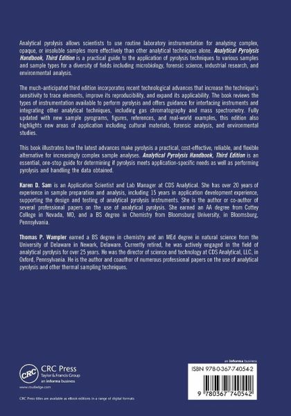 Karen D. Sam is an Application Scientist and Lab Manager at CDS Analytical. She has over 20 years of experience in sample preparation and analysis, including 15 years in application development experience, supporting the design and testing of analytical pyrolysis instruments. She is the author or co-author of several professional papers on the use of analytical pyrolysis. She holds an A.A. degree from Cottey College in Nevada, MO, and a B.S. degree in Chemistry from Bloomsburg University, in Bloomsburg, Pennsylvania. Thomas P. Wampler earned his B.S. degree (1970) in chemistry and an M.Ed. degree (1973) in natural science from the University of Delaware in Newark, Delaware. Currently retired, he was actively engaged in the field of analytical pyrolysis for over 25 years. He was the director of science and technology at CDS Analytical, LLC, in Oxford, Pennsylvania. He is the author and coauthor of numerous professional papers on the use of analytical pyrolysis and other thermal sampling techniques.