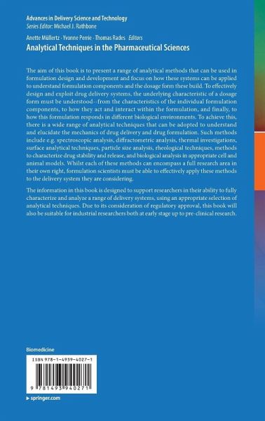 The aim of this book is to present a range of analytical methods that can be used in formulation design and development and focus on how these systems can be applied to understand formulation components and the dosage form these build. To effectively design and exploit drug delivery systems, the underlying characteristic of a dosage form must be understood--from the characteristics of the individual formulation components, to how they act and interact within the formulation, and finally, to how this formulation responds in different biological environments. To achieve this, there is a wide range of analytical techniques that can be adopted to understand and elucidate the mechanics of drug delivery and drug formulation. Such methods include e.g. spectroscopic analysis, diffractometric analysis, thermal investigations, surface analytical techniques, particle size analysis, rheological techniques, methods to characterize drug stability and release, and biological analysis in appropriate cell and animal models. Whilst each of these methods can encompass a full research area in their own right, formulation scientists must be able to effectively apply these methods to the delivery system they are considering. The information in this book is designed to support researchers in their ability to fully characterize and analyze a range of delivery systems, using an appropriate selection of analytical techniques. Due to its consideration of regulatory approval, this book will also be suitable for industrial researchers both at early stage up to pre-clinical research.
