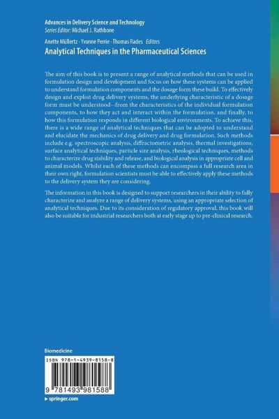 The aim of this book is to present a range of analytical methods that can be used in formulation design and development and focus on how these systems can be applied to understand formulation components and the dosage form these build. To effectively design and exploit drug delivery systems, the underlying characteristic of a dosage form must be understood--from the characteristics of the individual formulation components, to how they act and interact within the formulation, and finally, to how this formulation responds in different biological environments. To achieve this, there is a wide range of analytical techniques that can be adopted to understand and elucidate the mechanics of drug delivery and drug formulation. Such methods include e.g. spectroscopic analysis, diffractometric analysis, thermal investigations, surface analytical techniques, particle size analysis, rheological techniques, methods to characterize drug stability and release, and biological analysis in appropriate cell and animal models. Whilst each of these methods can encompass a full research area in their own right, formulation scientists must be able to effectively apply these methods to the delivery system they are considering. The information in this book is designed to support researchers in their ability to fully characterize and analyze a range of delivery systems, using an appropriate selection of analytical techniques. Due to its consideration of regulatory approval, this book will also be suitable for industrial researchers both at early stage up to pre-clinical research.