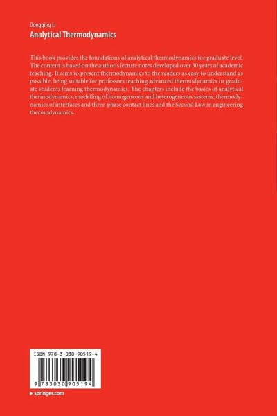 This book provides the foundations of analytical thermodynamics for graduate level. The content is based on the author's lecture notes developed over 30 years of academic teaching. It aims to present thermodynamics to the readers as easy to understand as possible, being suitable for professors teaching advanced thermodynamics or graduate students learning thermodynamics. The chapters include the basics of analytical thermodynamics, modelling of homogeneous and heterogeneous systems, thermodynamics of interfaces and three-phase contact lines and the Second Law in engineering thermodynamics.