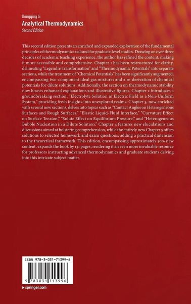 This second edition presents an enriched and expanded exploration of the fundamental principles of thermodynamics tailored for graduate-level studies. Drawing on over three decades of academic teaching experience, the author has refined the content, making it more accessible and comprehensive. Chapter 1 has been restructured for clarity, delineating "Legendre Transformation" and "Thermodynamic Potentials" into separate sections, while the treatment of "Chemical Potentials" has been significantly augmented, encompassing two-component ideal gas mixtures and a re-derivation of chemical potentials for dilute solutions. Additionally, the section on thermodynamic stability now boasts enhanced explanations and illustrative figures. Chapter 2 introduces a groundbreaking section, "Electrolyte Solution in Electric Field as a Non-Uniform System," providing fresh insights into unexplored realms. Chapter 3, now enriched with several new sections, delves into topics such as "Contact Angles on Heterogeneous Surfaces and Rough Surfaces," "Elastic Liquid-Fluid Interface," "Curvature Effect on Surface Tension," "Solute Effect on Equilibrium Pressure," and "Heterogeneous Bubble Nucleation in a Dilute Solution." Chapter 4 features new elucidations and discussions aimed at bolstering comprehension, while the entirely new Chapter 5 offers solutions to selected homework and exam questions, adding a practical dimension to the theoretical framework. This edition, encompassing approximately 50% new content, expands the book by 131 pages, rendering it an even more invaluable resource for professors instructing advanced thermodynamics and graduate students delving into this intricate subject matter.