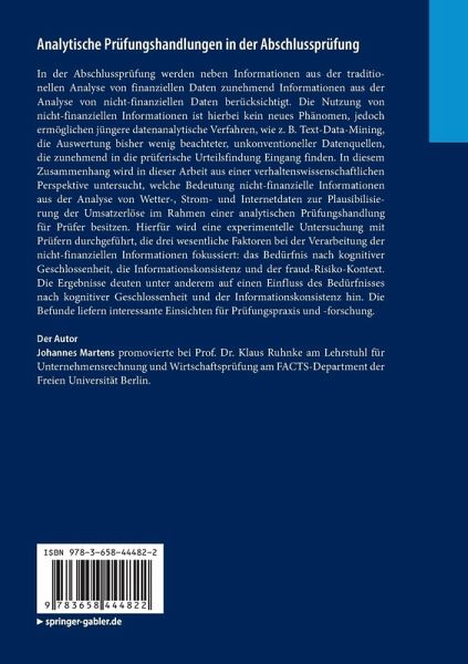 In der Abschlussprüfung werden neben Informationen aus der traditionellen Analyse von finanziellen Daten zunehmend Informationen aus der Analyse von nicht-finanziellen Daten berücksichtigt. Die Nutzung von nicht-finanziellen Informationen ist hierbei kein neues Phänomen, jedoch ermöglichen jüngere datenanalytische Verfahren, wie z. B. Text-Data-Mining, die Auswertung bisher wenig beachteter, unkonventioneller Datenquellen, die zunehmend in die prüferische Urteilsfindung Eingang finden. In diesem Zusammenhang wird in dieser Arbeit aus einer verhaltenswissenschaftlichen Perspektive untersucht, welche Bedeutung nicht-finanzielle Informationen aus der Analyse von Wetter-, Strom- und Internetdaten zur Plausibilisierung der Umsatzerlöse im Rahmen einer analytischen Prüfungshandlung für Prüfer besitzen. Hierfür wird eine experimentelle Untersuchung mit Prüfern durchgeführt, die drei wesentliche Faktoren bei der Verarbeitung der nicht-finanziellen Informationen fokussiert: das Bedürfnis nach kognitiver Geschlossenheit, die Informationskonsistenz und der fraud-Risiko-Kontext. Die Ergebnisse deuten unter anderem auf einen Einfluss des Bedürfnisses nach kognitiver Geschlossenheit und der Informationskonsistenz hin. Die Befunde liefern interessante Einsichten für Prüfungspraxis und -forschung.