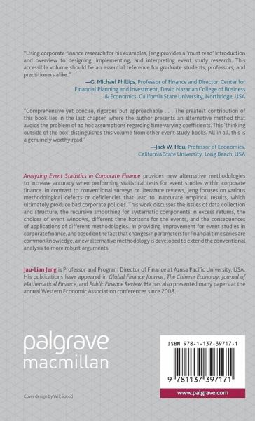 Analyzing Event Statistics in Corporate Finance provides new alternative methodologies to increase accuracy when performing statistical tests for event studies within corporate finance. In contrast to conventional surveys or literature reviews, Jeng focuses on various methodological defects or deficiencies that lead to inaccurate empirical results, which ultimately produce bad corporate policies. This work discusses the issues of data collection and structure, the recursive smoothing for systematic components in excess returns, the choices of event windows, different time horizons for the events, and the consequences of applications of different methodologies. In providing improvement for event studies in corporate finance, and based on the fact that changes in parameters for financial time series are common knowledge, a new alternative methodology is developed to extend the conventionalanalysis to more robust arguments.