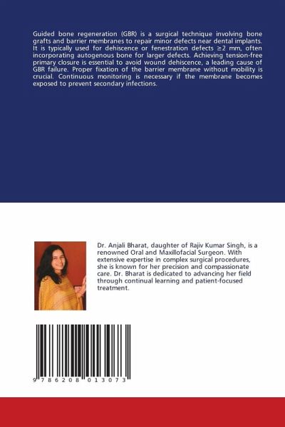 Guided bone regeneration (GBR) is a surgical technique involving bone grafts and barrier membranes to repair minor defects near dental implants. It is typically used for dehiscence or fenestration defects 2 mm, often incorporating autogenous bone for larger defects. Achieving tension-free primary closure is essential to avoid wound dehiscence, a leading cause of GBR failure. Proper fixation of the barrier membrane without mobility is crucial. Continuous monitoring is necessary if the membrane becomes exposed to prevent secondary infections.