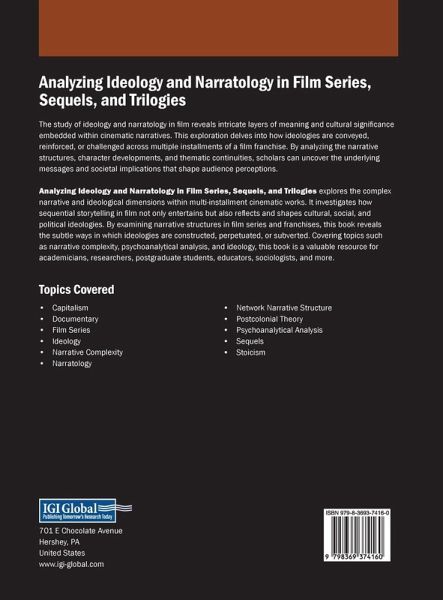The study of ideology and narratology in film reveals intricate layers of meaning and cultural significance embedded within cinematic narratives. This exploration delves into how ideologies are conveyed, reinforced, or challenged across multiple installments of a film franchise. By analyzing the narrative structures, character developments, and thematic continuities, scholars can uncover the underlying messages and societal implications that shape audience perceptions. Analyzing Ideology and Narratology in Film Series, Sequels, and Trilogies explores the complex narrative and ideological dimensions within multi-installment cinematic works. It investigates how sequential storytelling in film not only entertains but also reflects and shapes cultural, social, and political ideologies. By examining narrative structures in film series and franchises, this book reveals the subtle ways in which ideologies are constructed, perpetuated, or subverted. Covering topics such as narrative complexity, psychoanalytical analysis, and ideology, this book is a valuable resource for academicians, researchers, post-graduate students, educators, sociologists, and more.