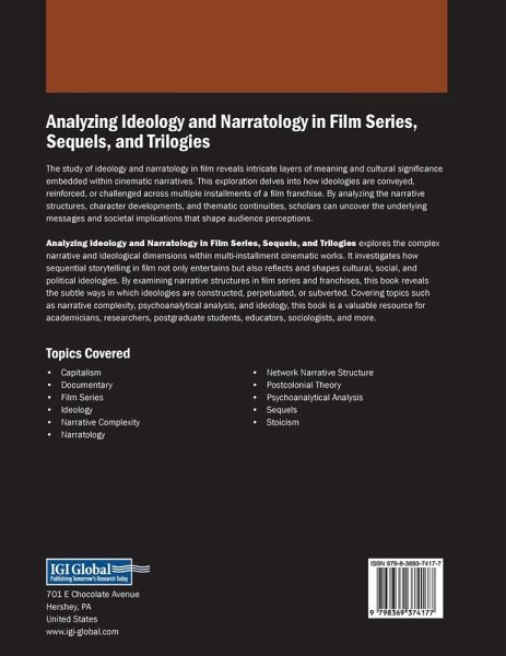 The study of ideology and narratology in film reveals intricate layers of meaning and cultural significance embedded within cinematic narratives. This exploration delves into how ideologies are conveyed, reinforced, or challenged across multiple installments of a film franchise. By analyzing the narrative structures, character developments, and thematic continuities, scholars can uncover the underlying messages and societal implications that shape audience perceptions. Analyzing Ideology and Narratology in Film Series, Sequels, and Trilogies explores the complex narrative and ideological dimensions within multi-installment cinematic works. It investigates how sequential storytelling in film not only entertains but also reflects and shapes cultural, social, and political ideologies. By examining narrative structures in film series and franchises, this book reveals the subtle ways in which ideologies are constructed, perpetuated, or subverted. Covering topics such as narrative complexity, psychoanalytical analysis, and ideology, this book is a valuable resource for academicians, researchers, post-graduate students, educators, sociologists, and more.