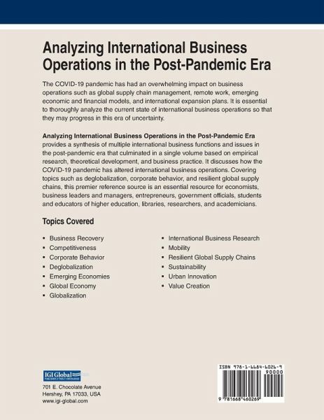 The COVID-19 pandemic has had an overwhelming impact on business operations such as global supply chain management, remote work, emerging economic and financial models, and international expansion plans. It is essential to thoroughly analyze the current state of international business operations so that they may progress in this era of uncertainty. Analyzing International Business Operations in the Post-Pandemic Era provides a synthesis of multiple international business functions and issues in the post-pandemic era that culminated in a single volume based on empirical research, theoretical development, and business practice. It discusses how the COVID-19 pandemic has altered international business operations. Covering topics such as deglobalization, corporate behavior, and resilient global supply chains, this premier reference source is an essential resource for economists, business leaders and managers, entrepreneurs, government officials, students and educators of higher education, libraries, researchers, and academicians.