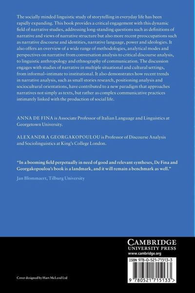 The socially minded linguistic study of storytelling in everyday life has been rapidly expanding. This book provides a critical engagement with this dynamic field of narrative studies, addressing long-standing questions such as definitions of narrative and views of narrative structure but also more recent preoccupations such as narrative discourse and identities, narrative language, power and ideologies. It also offers an overview of a wide range of methodologies, analytical modes and perspectives on narrative from conversation analysis to critical discourse analysis, to linguistic anthropology and ethnography of communication. The discussion engages with studies of narrative in multiple situational and cultural settings, from informal-intimate to institutional. It also demonstrates how recent trends in narrative analysis, such as small stories research, positioning analysis and sociocultural orientations, have contributed to a new paradigm that approaches narratives not simply as texts, but rather as complex communicative practices intimately linked with the production of social life. The linguistic study of storytelling in everyday life has been rapidly expanding. This book provides a critical engagement with this field of narrative studies, addressing long-standing questions such as definitions of narrative and views of narrative structure but also more recent preoccupations such as narrative discourse and narrative language.