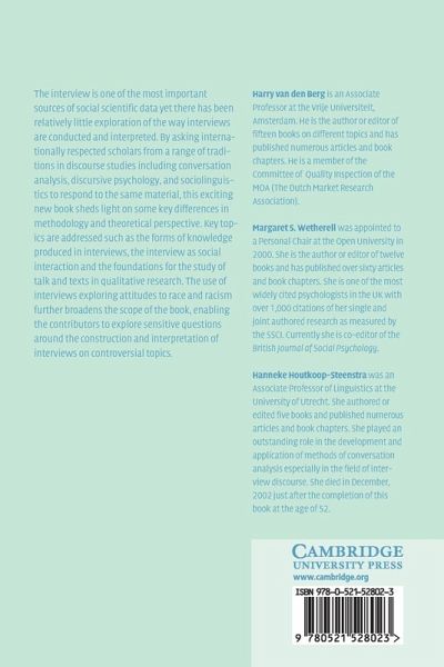 Harry van den Berg is an Associate Professor at the Vrije Universiteit, Amsterdam. He is the author or editor of 15 books on different topics and has published numerous articles and book chapters. He is a member of the Committee of Quality Inspection of the MOA (The Dutch Market Research Association). Margaret S. Wetherell was appointed to a Personal Chair at the Open University in 2000. She is the author or editor of 12 books and has published over 60 articles and book chapters. She is one of the most widely cited psychologists in the UK with over 1,000 citations of her single and joint authored research as measured by the SSCI. Currently she is co-editor of the British Journal of Social Psychology. Hanneke Houtkoop-Steenstra was an associate professor at the Unviersity of Utrecht. She authored or edited 5 books and published numerous articles and book chapters. She played an outstanding role in the development and application of methods of conversation analysis especially in the field of interview discourse. She died in December 2002 just after the completion of this book at the age of 52.