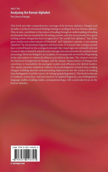 This book provides comprehensive coverage of the Korean alphabet, Hangul, and includes a synthesis of research findings relating to reading in the non-Roman alphabet. This, in turn, contributes to the science of reading through an understanding of reading mechanisms that are essential for all writing systems, and that are particular for a given writing system. Hangul has been recognized as "the world's best alphabet," "one of the great intellectual achievements of Mankind," and "alphabet's epitome, a star among alphabets" by international linguists and historians. It is known that writing systems have evolved based on the ecological principle that visual signs are culturally selected to match objects found in natural scenes through selection pressures for optimal visual processing. However, Hangul is an exception. It was purposely invented by King Sejong in the 15th century to combat the illiteracy prevalent at the time. The chapters excavate the historical background of Hangul, and the unique characteristics of Hangul that contribute to learnability for emergent readers and efficiency for skilled readers. The author presents empirical evidence of psycholinguistic research into reading Hangul, building theories and presenting implications for the science of reading (psycholinguistics) and the science of writing (grapholinguistics). This book is relevant to students, researchers, and practitioners in applied linguistics, psycholinguistics, language studies, reading studies, and grammatology, with a particular focus on the Korean alphabet.