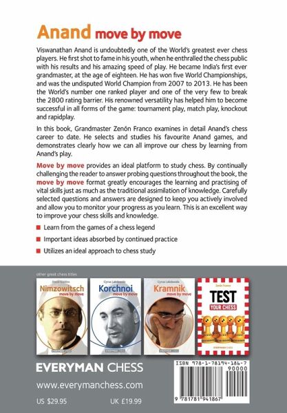 Viswanathan Anand is undoubtedly one of the World's greatest ever chess players. He first shot to fame in his youth, when he enthralled the chess public with his results and his amazing speed of play. He became India's first ever grandmaster, at the age of eighteen. He has won five World Championships, and was the undisputed World Champion from 2007 to 2013. He's been the World number one ranked player and one of the very few to break the 2800 rating barrier. His renowned versatility has help him to become successful in all forms of the game: tournament play, match play, knockout and rapidplay. In this book, Grandmaster Zenón Franco examines in detail Anand's chess career to date. He selects and studies his favourite Anand games, and demonstrates clearly how we can all improve our chess by learning from Anand's play. Move by Move provides an ideal platform to study chess. By continually challenging the reader to answer probing questions throughout the book, the Move by Move format greatly encourages the learning and practising of vital skills just as much as the traditional assimilation of knowledge. Carefully selected questions and answers are designed to keep you actively involved and allow you to monitor your progress as you learn. This is an excellent way to improve your chess skills and knowledge.