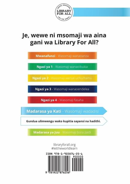Anansi has the pot containing all wisdom. But what will Anansi do when his son gives him good advice when he feels he should be the only wise one? Anansi ana chungu chenye hekima Zote. Lakini Anansi atafanya nini kama mtoto wake atakapompa ushauri mzuri anapohisi kuwa ndiye pekee mwenye hekima? Your purchase of this book supports Library For All in its mission to make knowledge available to all, equally.
