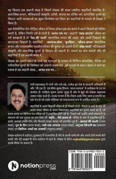 Anant Path Par is a collection of seventeen selected stories. Stories about a little boy who sells balloons discovers the source of the smile of his little sister; a lady breastfeeding a small child in public shows the delicate yet strong character of a mother; an ambulance driver takes a day off and switches off his mobile phone only to witness the most horrific incident in his family that day; a thalassemia patient gives up on her life and only lives by painting her thoughts in a closed room; a father throws a lavish party for his kid and then learns a shocking truth about the food that was wasted; a young boy meets with an accident and his parents decide something important; and a young labourer learns a tough lesson when he takes an unreasonable cut on an old labourer's hard-earned money, taking advantage of his circumstances; and many more... The author's present creation "Anant Path Par" intends to bring to the notice of readers the importance and relevance of social, moral and family values through acts and messages conveyed by the protagonist and various characters.