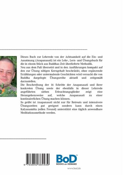 Dieses Buch zur Lehrrede von der Achtsamkeit auf die Ein- und Ausatmung (Anapanasati) ist ein Lehr-, Lern- und Übungsbuch für die in einem Stück aus Buddhas Zeit überlieferte Methodik. Neu aus dem Pali übersetzt und in den Ausführungen kompakt auf den zur Übung nötigen Kerngehalt beschränkt, ohne ergänzende Erzählungen oder untermalende Geschichten wird versucht die von Buddha dargelegte Übungsreihe aktuell und zeitgemäß darzustellen.Die Beschreibung der 16 Schritte der Anapanasati und ihrer konkreten Übung sowie der ebenfalls in dieser Lehrrede angeführten sieben Erleuchtungsglieder zeigt eine Herangehensweise auf, welche Anapanasati zu einer kontinuierlichen Übung machen können.So geübt ist Anapanasati nicht nur für Retreats und intensivere Übungszeiten gut geeignet sondern kann durch einen Kalyanamitta (edlen Freund) unterstützt eine täglich anwendbare Meditationsmethode werden.