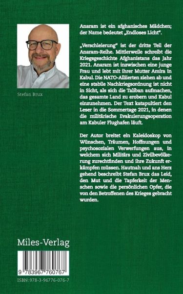 Anaram ist ein afghanisches Mädchen; der Name bedeutet 'Endloses Licht'. 'Verschleierung' ist der dritte Teil der Anaram-Reihe. Mittlerweile schreibt die Kriegsgeschichte Afghanistans das Jahr 2021. Anaram ist inzwischen eine junge Frau und lebt mit ihrer Mutter Amira in Kabul. Die NATO-Alliierten ziehen ab und eine stabile Nachkriegsordnung ist nicht in Sicht, als sich die Taliban aufmachen, das gesamte Land zu erobern und Kabul einzunehmen. Der Text katapultiert den Leser in die Sommertage 2021, in denen die militärische Evakuierungsoperation am Kabuler Flughafen läuft. Der Autor breitet ein Kaleidoskop von Wünschen, Träumen, Hoffnungen und psychosozialen Verwerfungen aus, in welchem sich Militärs und Zivilbevölkerung zurechtfinden und ihre Zukunft erkämpfen müssen. Hautnah und ans Herz gehend beschreibt Stefan Brux das Leid, den Mut und die Tapferkeit der Menschen sowie die persönlichen Opfer, die von den Betroffenen des Krieges gebracht wurden.
