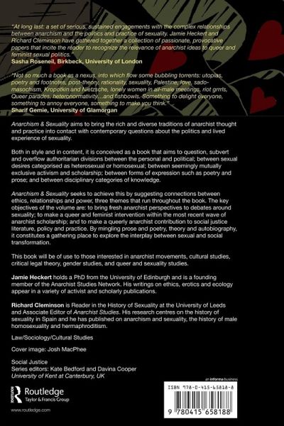 Anarchism & Sexuality aims to bring the rich and diverse traditions of anarchist thought and practice into contact with contemporary questions about the politics and lived experience of sexuality. Both in style and in content, it is conceived as a book that aims to question, subvert and overflow authoritarian divisions between the personal and political; between sexual desires categorised as heterosexual or homosexual; between seemingly mutually exclusive activism and scholarship; between forms of expression such as poetry and prose; and between disciplinary categories of knowledge. Anarchism & Sexuality seeks to achieve this by suggesting connections between ethics, relationships and power, three themes that run throughout. The key objectives of the book are: to bring fresh anarchist perspectives to debates around sexuality; to make a queer and feminist intervention within the most recent wave of anarchist scholarship; and to make a queerly anarchist contribution to social justice literature, policy and practice. By mingling prose and poetry, theory and autobiography, it constitutes a gathering place to explore the interplay between sexual and social transformation.This book will be of use to those interested in anarchist movements, cultural studies, critical legal theory, gender studies, and queer and sexuality studies.