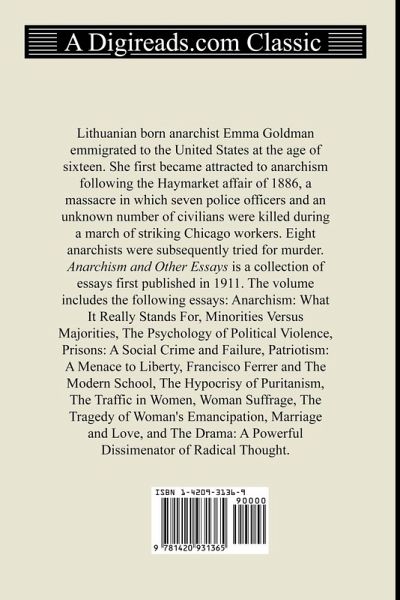 Lithuanian born anarchist Emma Goldman emmigrated to the United States at the age of sixteen. She first became attracted to anarchism following the Haymarket affair of 1886, a massacre in which seven police officers and an unknown number of civilians were killed during a march of striking Chicago workers. Eight anarchists were subsequently tried for murder. "Anarchism and Other Essays" is a collection of essays first published in 1911. The volume includes the following essays: Anarchism: What It Really Stands For, Minorities Versus Majorities, The Psychology of Political Violence, Prisons: A Social Crime and Failure, Patriotism: A Menace to Liberty, Francisco Ferrer and The Modern School, The Hypocrisy of Puritanism, The Traffic in Women, Woman Suffrage, The Tragedy of Woman's Emancipation, Marriage and Love, and The Drama: A Powerful Dissimenator of Radical Thought.