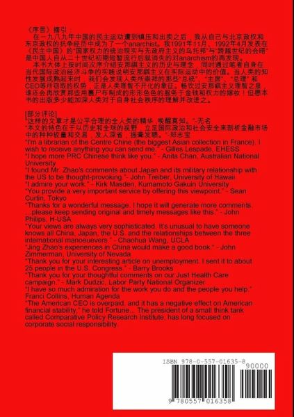 This is the first book from a Chinese perspective to review Anarchism's theory and practice, with the author's worldwide experience since the 1989 Tiananmen Square Incident. Here are some comments: "I'm a librarian of the biggest Asian collection in France. I wish to receive anything from you." - Gilles Lespade "I hope more PRC Chinese think like that." - Anita Chan "I found Mr. Zhao's comments about Japan and its military relationship with the US to be thought-provoking." - John Treiber "Your views are always very sophisticated. It's unusual to have someone knows all China, Japan, the U.S. and the relationships between the three international maneuvers." - Chaohua Wang "Jing Zhao's experiences in China would make a good book." - John Zimmerman "I sent it to about 25 people in the U.S. Congress." - Barry Brooks "Thank you for your thoughtful comments on our Just Health Care campaign." - Mark Dudzic