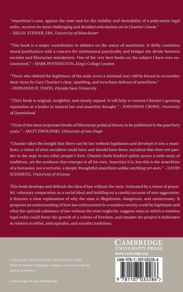 This book elaborates and defends the idea of law without the state. Animated by a vision of peaceful, voluntary cooperation as a social ideal and building on a careful account of non-aggression, it features a clear explanation of why the state is illegitimate, dangerous and unnecessary. It proposes an understanding of how law enforcement in a stateless society could be legitimate and what the optimal substance of law without the state might be, suggests ways in which a stateless legal order could foster the growth of a culture of freedom, and situates the project it elaborates in relation to leftist, anti-capitalist and socialist traditions.
