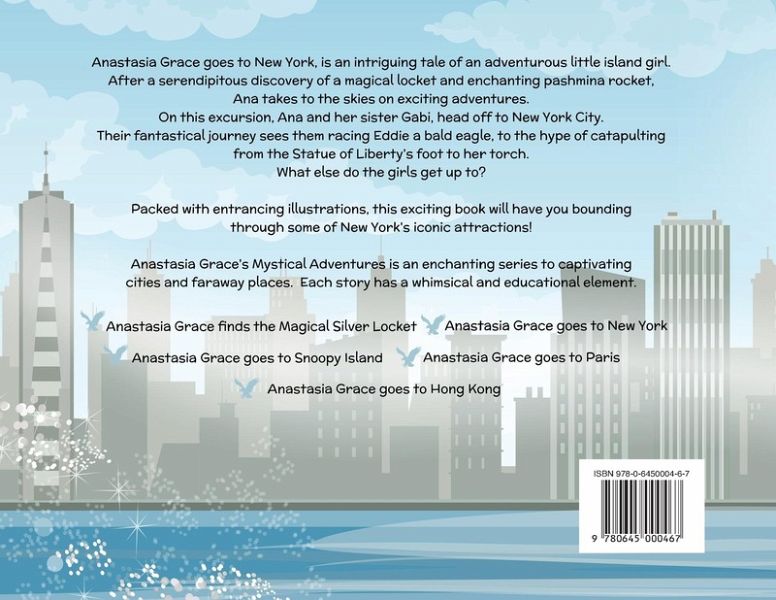 Anastasia Grace goes to New York, is an intriguing tale of an adventurous little island girl. After a serendipitous discovery of a magical locket and enchanting pashmina rocket, Ana takes to the skies on exciting adventures. On this excursion, Ana and her sister Gabi, head off to New York City. Their fantastical journey sees them racing Eddie a bald eagle, to the hype of catapulting from the Statue of Liberty's foot to her torch. What else do the girls get up to? Packed with entrancing illustrations, this exciting book will have you bounding through some of New York's iconic attractions! This is the second book in the Anastasia Grace's Mystical Adventures Series - an enchanting series to captivating cities and faraway places. Each story has a whimsical and educational element. - Anastasia Grace finds the Magical Silver Locket - Anastasia Grace goes to New York - Anastasia Grace goes to Snoopy Island - Anastasia Grace goes to Paris - Anastasia Grace goes to Hong Kong