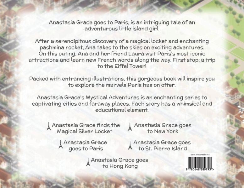 After the discovery of a magical locket and enchanting pashmina rocket, Anastasia Grace takes to the skies on exciting adventures all around the world. In Anastasia Grace Goes To Paris, Ana and her friend Laura visit the city's most iconic attractions and learn new French words along the way. First stop: a trip to the Eiffel Tower! Anastasia Grace Goes To Paris is the fifth book in Anastasia Grace's Mystical Adventures series. The series follows Ana's adventures to captivating cities and faraway places, with each book having a whimsical and educational element.