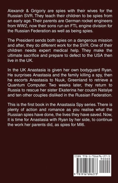 Alexandr and Grigoriy, brothers are spies for the Russian Federation SVR and teach their children their trade. Victor, 19 needs an operation he cannot get in Russia without having the entire family executed. Victor needs a sex change operation, so the family make the ultimate sacrifice and defect to the USA, then will live in the UK.Just before their planned defection, they are told their eldest daughters, Ekaterina and Natalye, must remain in St. Petersburg. After saving the life of their Vice President in Paris, they are killed in a planned plane explosion by the CIA. They get to CIA Langley, while their two daughters become lesbian lovers in Russia. They invent the first Quantum Computer, taking their huge Starships, to distant planets, and inhabit the Moon.In the UK Anastasia is given a bodyguard, Ryan, an expert in languages from Australia. He is thought to be timid but likes Anastasia. He is armed, Anastasia wears a thigh holster with a Russian Gloc. One evening, Anastasia asks Ryan to take out the driver of her parents' car. She is sure he is a spy. Ryan kills the driver and is looked on in a different light. The following day, he escorts Anastasia to NUUK Greenland to retrieve a Quantum Computer. While wating to meet their contact from Russia, She sees a jewellers and thinking of her past, she asks Ryan to buy her an engagement ring and two wedding rings to make their cover look authentic.By the afternoon they are married, the following night, they meet a group of people, who seem very friendly and very touchy. When they return to their hotel room, Ryan removes the slips of paper from their bodies revealing the date they will get help to rescue Ekaterina and NatalyeTwo weeks later they are in Russia in a firefight, to get the Sisters out of Russia with ten couples onto a US Submarine. When it looks like they will all die, the people they met in Nuuk, help fight the Russians, then three Australian fighter jets take out two Migs, allowing the Submarine to get free.It is then, Anastasia realises the power her husband can yield, as she learns, he is a Captain of the Australian Air Force attached to NATO. He yields as much power and command as her father can. On their return to the UK. Anastasia and Ryan are asked by the Director of MI6 if they will carry out missions for them. A month later they are given their first job, continued in The Nuclear Incident