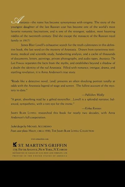 Anastasia--the name has become synonymous with enigma. the story of the youngest daughter of the last Russian czar has become one of the world's most favorite romantic fascinations, and is one of the strangest, saddest, most haunting riddle of the twentieth century: Did she escape the massacre of the Russian Royal family in 1917? James Blair Lovell's exhaustive search for the truth culminates in the definitive book, the last word on the mystery of Anastasia. Drawn form eyewitness testimony, medical and scientific study, handwriting analysis, and a cache of thousands of documents, letters, paintings, private photographs, and audio tapes, Anastasia: The Lost Princess separates the facts from the myths, and establishes beyond a shadow of a doubt the identity of the real Anastasia. Filled with romance, intrigue, drama, and startling revelation, it is Anna Anderson's true story.