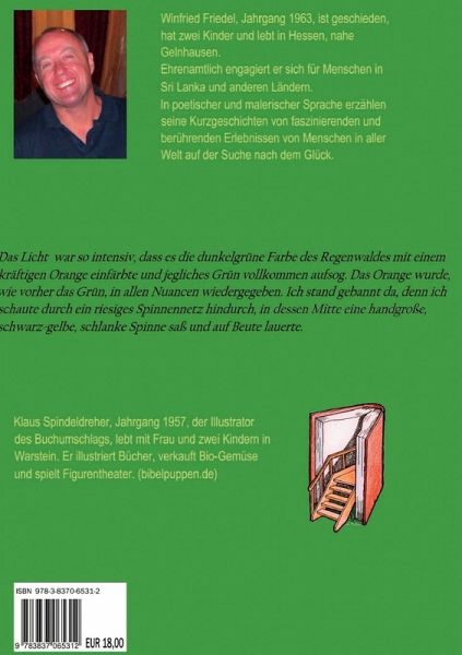 Das Licht war so intensiv, dass es die dunkelgrüne Farbe des Regenwaldes mit einem kräftigen Orange einfärbte und jegliches Grün vollkommen aufsog. Das Orange wurde, wie vorher das Grün, in allen Nuancen wiedergegeben. Ich stand gebannt da, denn ich schaute durch ein riesiges Spinnennetz hindurch, in dessen Mitte eine handgroße, schwarz-gelbe, schlanke Spinne saß und auf Beute lauerte.