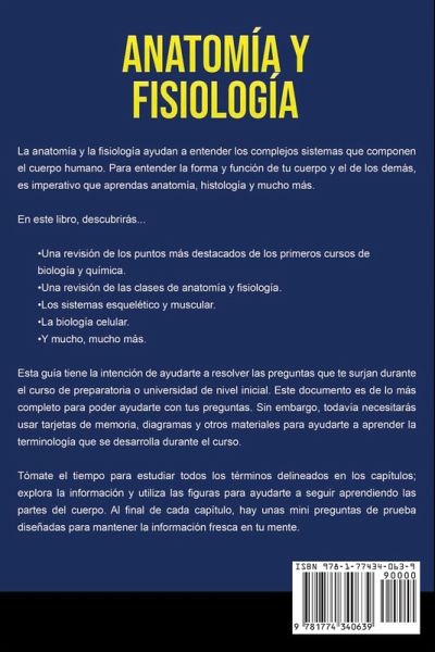 La anatomía y la fisiología ayudan a entender los complejos sistemas que componen el cuerpo humano. Para entender la forma y función de tu cuerpo y el de los demás, es imperativo que aprendas anatomía, histología y mucho más. En este libro, descubrirás: ¿ Una revisión de los puntos más destacados de los primeros cursos de biología y química. ¿ Una revisión de las clases de anatomía y fisiología. ¿ Los sistemas esquelético y muscular. ¿ La biología celular. ¿ Y mucho, mucho más. Esta guía tiene la intención de ayudarte a resolver las preguntas que te surjan durante el curso de preparatoria o universidad de nivel inicial. Este documento es de lo más completo para poder ayudarte con tus preguntas. Sin embargo, todavía necesitarás usar tarjetas de memoria, diagramas y otros materiales para ayudarte a aprender la terminología que se desarrolla durante el curso. Tómate el tiempo para estudiar todos los términos delineados en los capítulos; explora la información y utiliza las figuras para ayudarte a seguir aprendiendo las partes del cuerpo. Al final de cada capítulo, hay unas mini preguntas de prueba diseñadas para mantener la información fresca en tu mente.
